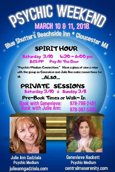 Our Psychic Weekend is coming up this Friday and Saturday, and we’d like to extend an invitation to any and all on Cape Ann to join us for one of the most popular off-season happenings at the Blue Shutters.