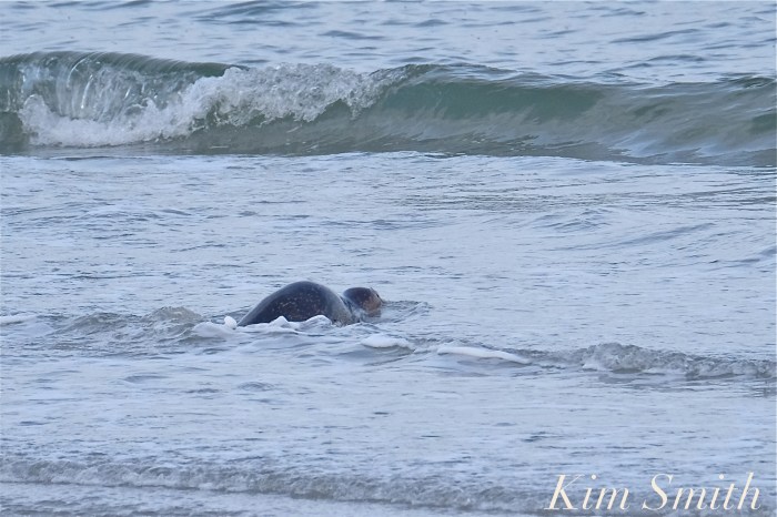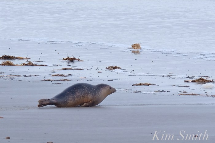 Walking along a sandy beach this morning I looked up to see in the distance a Harbor Seal hauled out at the water’s edge. I took a few photos, and then slowly walked backwards, towards the wrack line, in the opposite direction of the seal. After about half an hour, the seal fishtailed down to the water and was quickly lost in the surf.