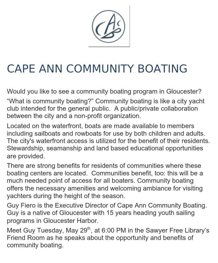 Attached is a flyer: the project is Cape Ann Community Boating and we will be holding a public meeting Tuesday, May 29th, at 6:00 PM in the Sawyer Free Library’s Friend Room. I met with the Mayor last week and I will be pursuing a capital campaign this year with the hope of opening next spring.