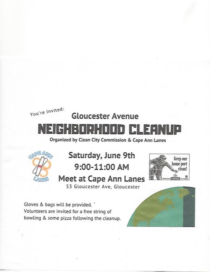 The Clean City Commission is excited to partner with Cape Ann Lanes for a neighborhood cleanup on Gloucester Ave on Saturday, June 9th! Join us from 9-11 for a cleanup, followed by free pizza and a round of bowling, courtesy of Cape Ann Lanes. This will be a great family-friendly event! Trash bags and gloves will be provided.