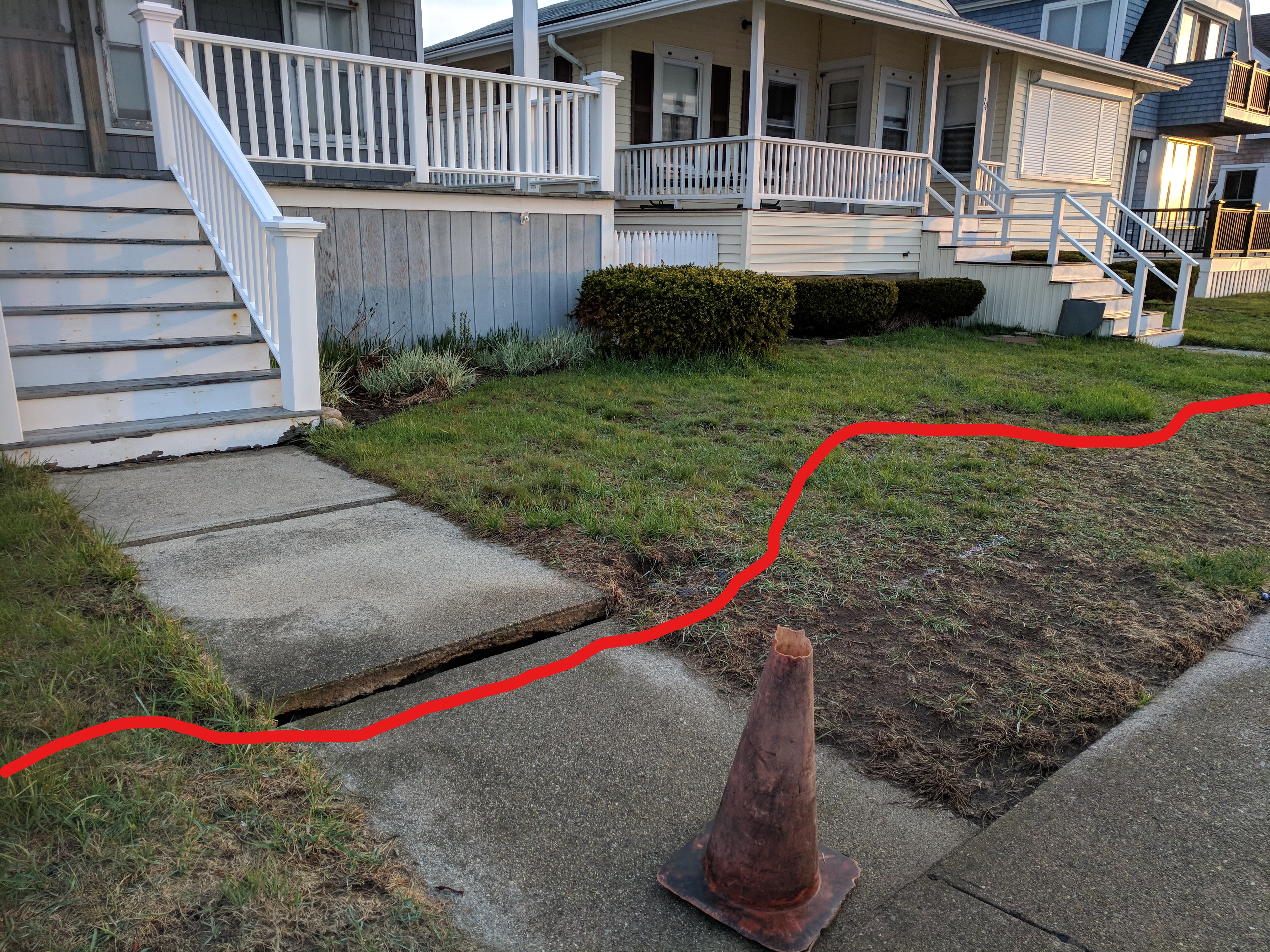 storm damage fissure along front cottages Long Beach seawall walkway – marked up ©c Ryan