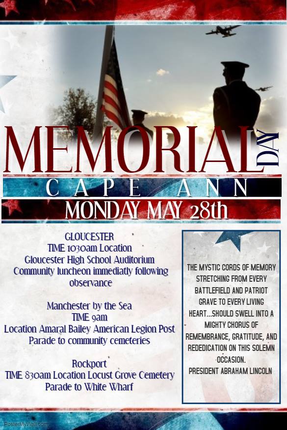 Please consider attending one of our Cape Ann Communities Memorial Day Observances. On Monday May 28, 2018 we will dedicated our time to honor and remember the ultimate sacrifice bore by so many young Americans on various battlefields and remember all those Veterans who have passed away. We are brought together by the notion of preserving the memory of our loved ones and as Veterans, Gold Star, Families, Friends, and Community we will ensure that those memories never fade into the darkness.