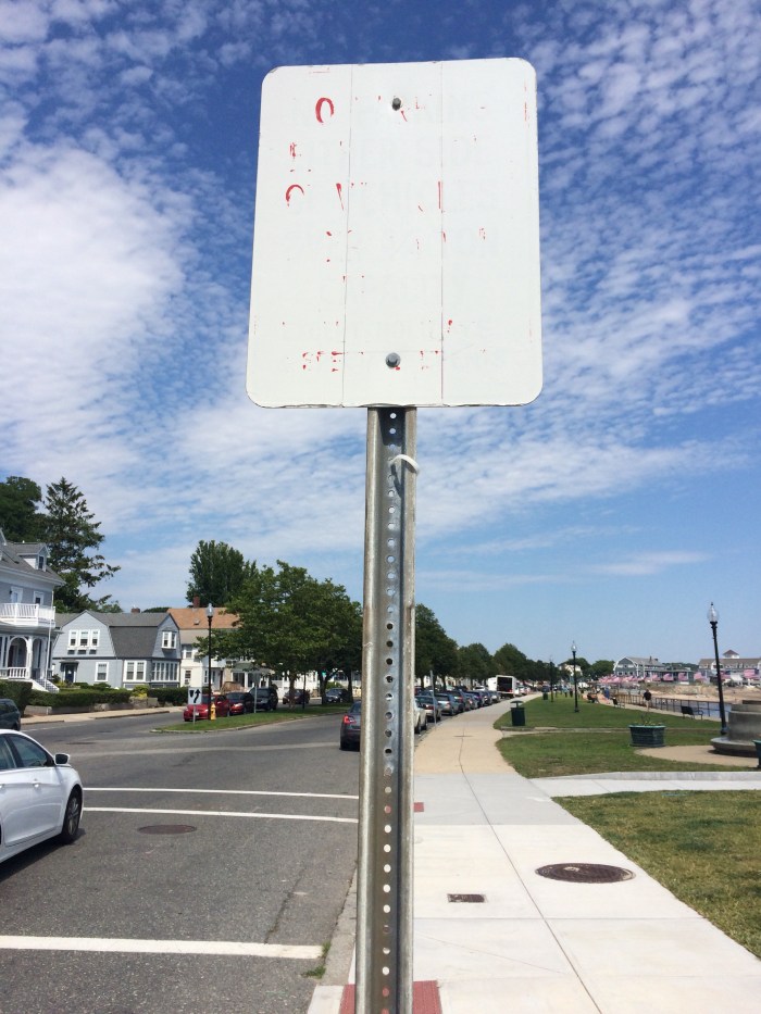 I was thinking about the recent sign posted at the bridge prohibiting vehicles on the sidewalk while we were waiting there recently. At first glance, this nearby sign appeared to be blank on both sides, so I was curious. You can see how faded the lettering is and I can’t quite tell what it is supposed to say.