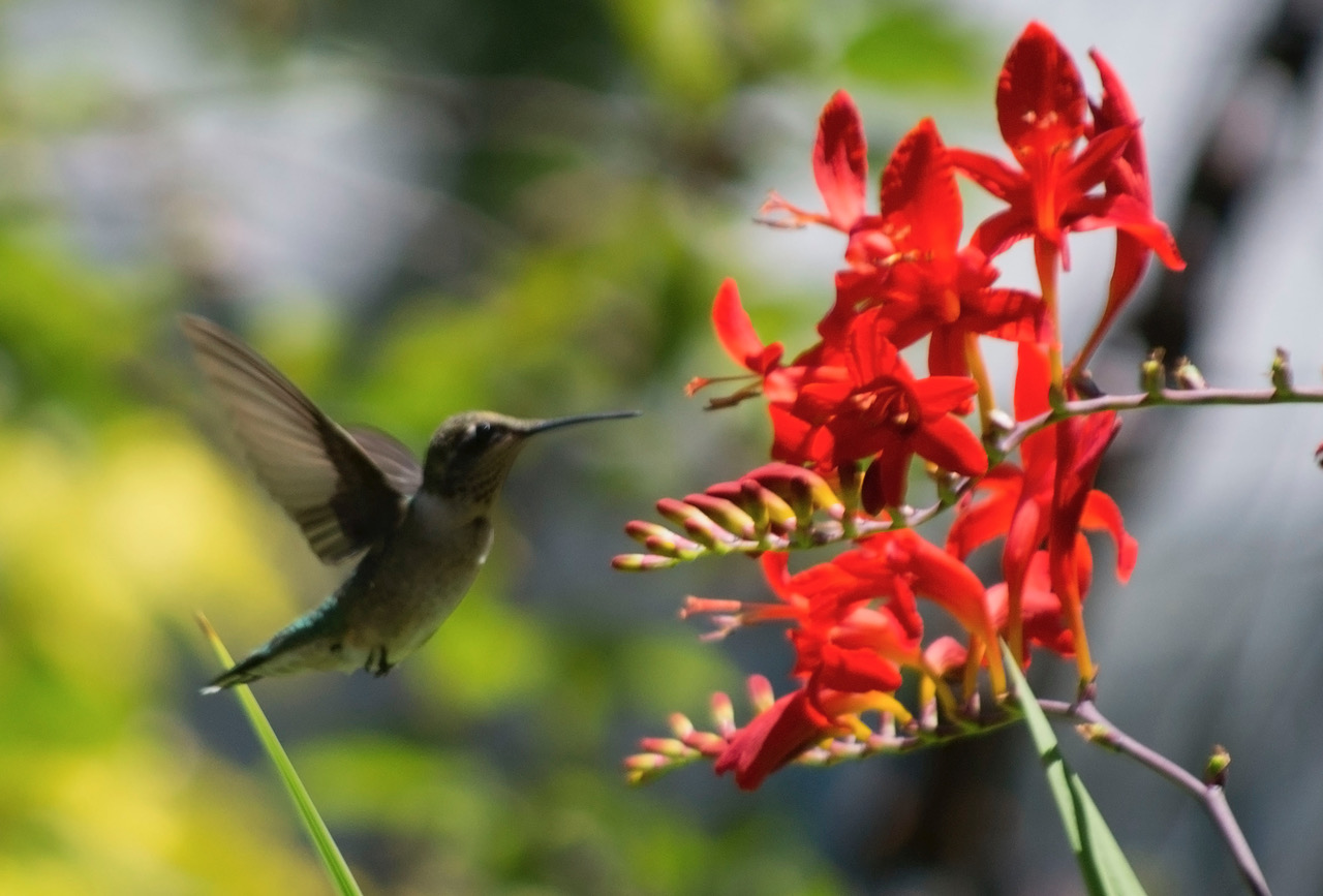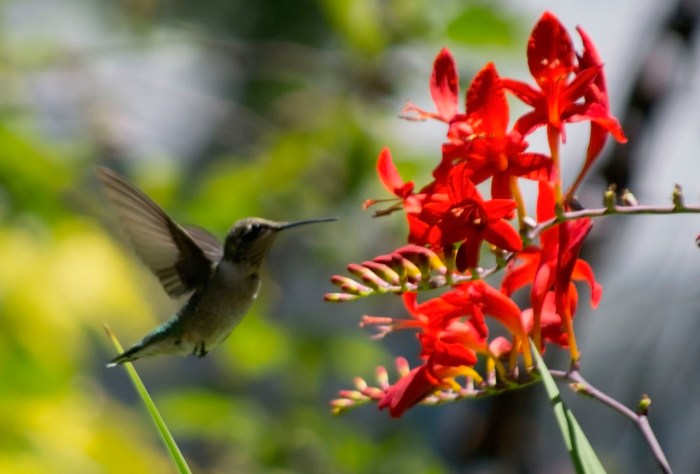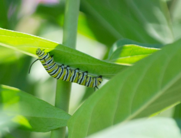 Jackie Bennet, who works at Corliss in Ipswich, shares recent sightings of a male Monarch butterfly and caterpillar, and a female Ruby-throated Hummingbird on the crocosmia.