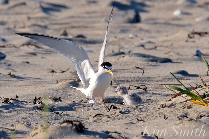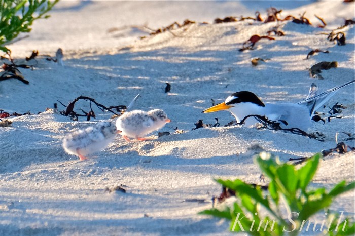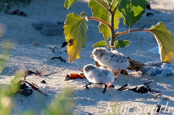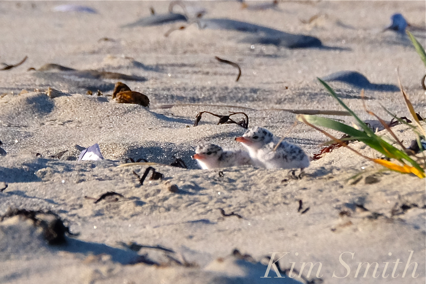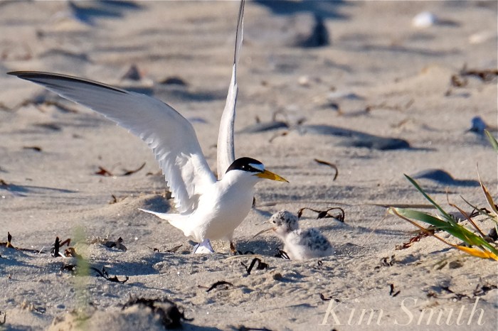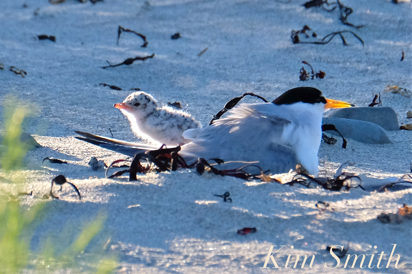 Almost as adorable as are Piping Plover chicks are Least Tern chicks. However, they are much, much harder to film and to photograph. Least Terns are shyer of humankind than are Piping Plovers. Anyone who has seen PiPl in action know that they have a high tolerance for people and may come right up to you especially if you are standing perfectly still and are perfectly quiet. Least Terns on the other hand are elusive and skittish. The nestlings quickly take cover behind a rock or clump of beach vegetation when disturbed. The Mom and Dad when both courting and nesting will let you know if you are too close by dive bombing and if you still can’t take a hint, will poop on your head. If either happens, then you know for sure you are way too close and are interfering with the chicks feeding. Back away and observe from a more considerate (considerate-to-the-Terns distance that is). Unfortunately, I recently observed a fellow photographer repeatedly being dive-bombed by a nesting pair of Terns, and that person has a humongously long telephoto lens. She would have gotten perfectly lovely photos from a distance more respectful of the Terns.