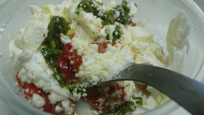 Mix sour cream, parmesan cheese, basil paste, feta and sun dried tomatos for the stuffing.