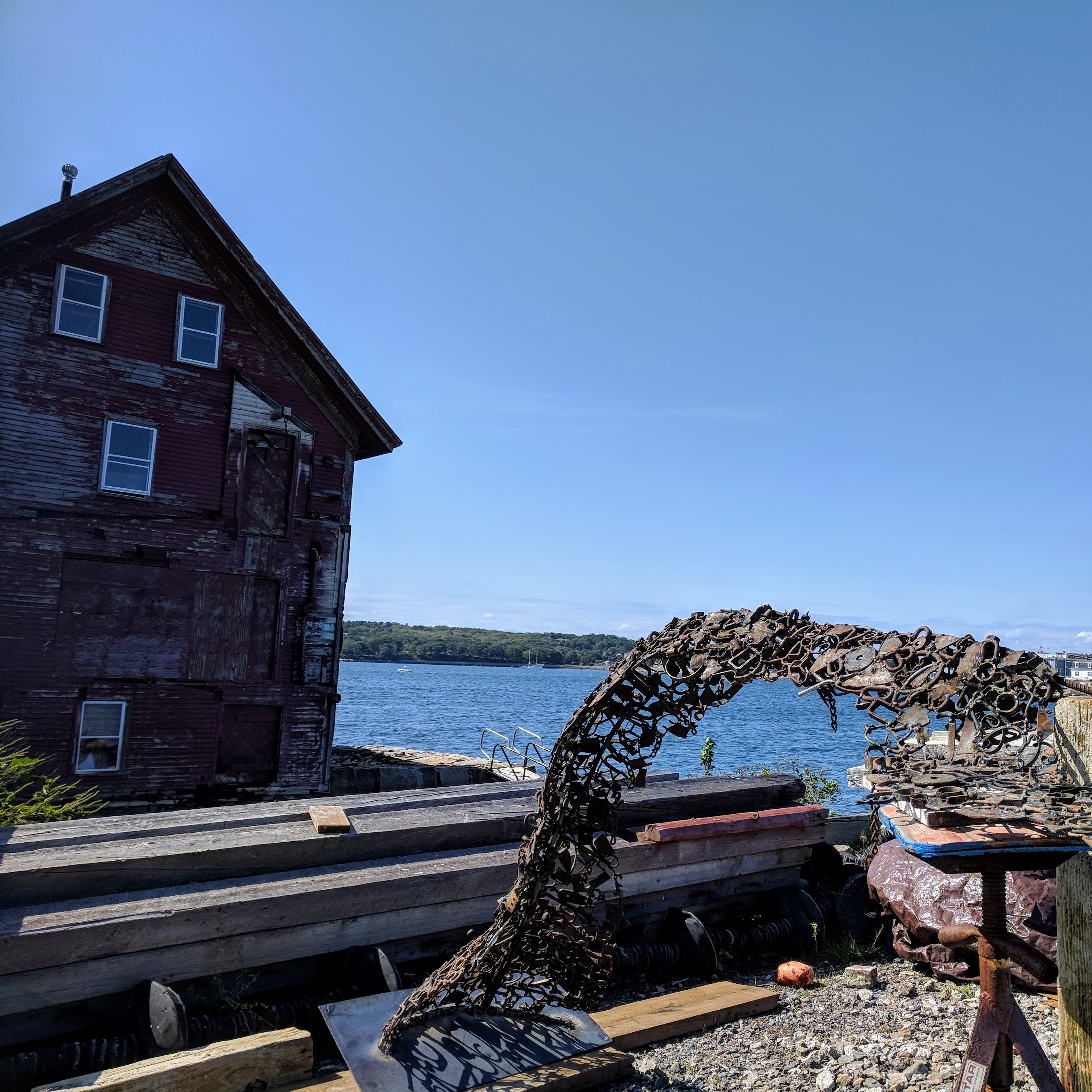 DEBORAH REDWOOD Goetemann Artist Residency Rocky Neck_2018 Sept 21_environmental installation artist_sculpture in progress fluke whale tail on site Ocean Alliance Gloucester MA©catherin