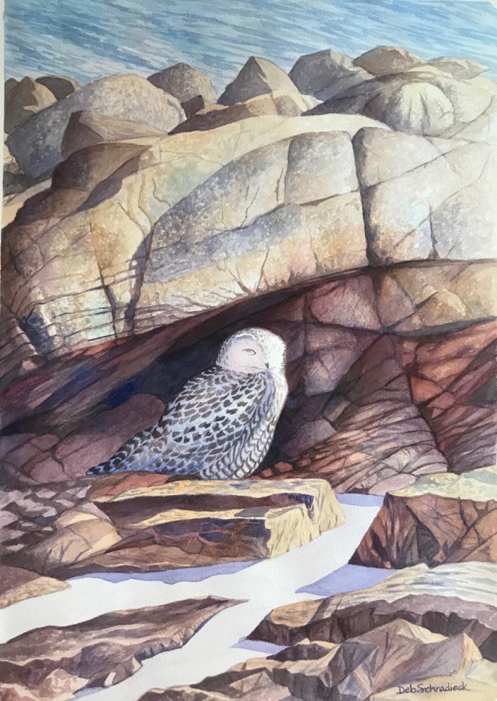 While chatting with Cape Ann artist Deb Schradieck and her husband Peter last night at the Good Morning Gloucester holiday bash and amazing bbq, held at Cape Ann Giclee, Deb mentioned she had done a painting of our Snowy Owl Hedwig. The painting is of Hedwig dozing off, nestled under a rocky alcove on Atlantic Road. We would often see her resting, especially during the middle of the day, in between meals. Beautiful capture Deb!