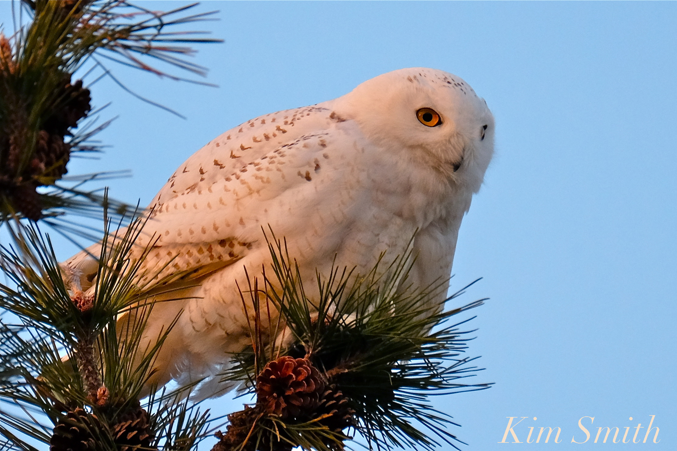 Snowy Owl Bubo scandiacus Pine Tree Massachusetts -4 copyright Kim Smith