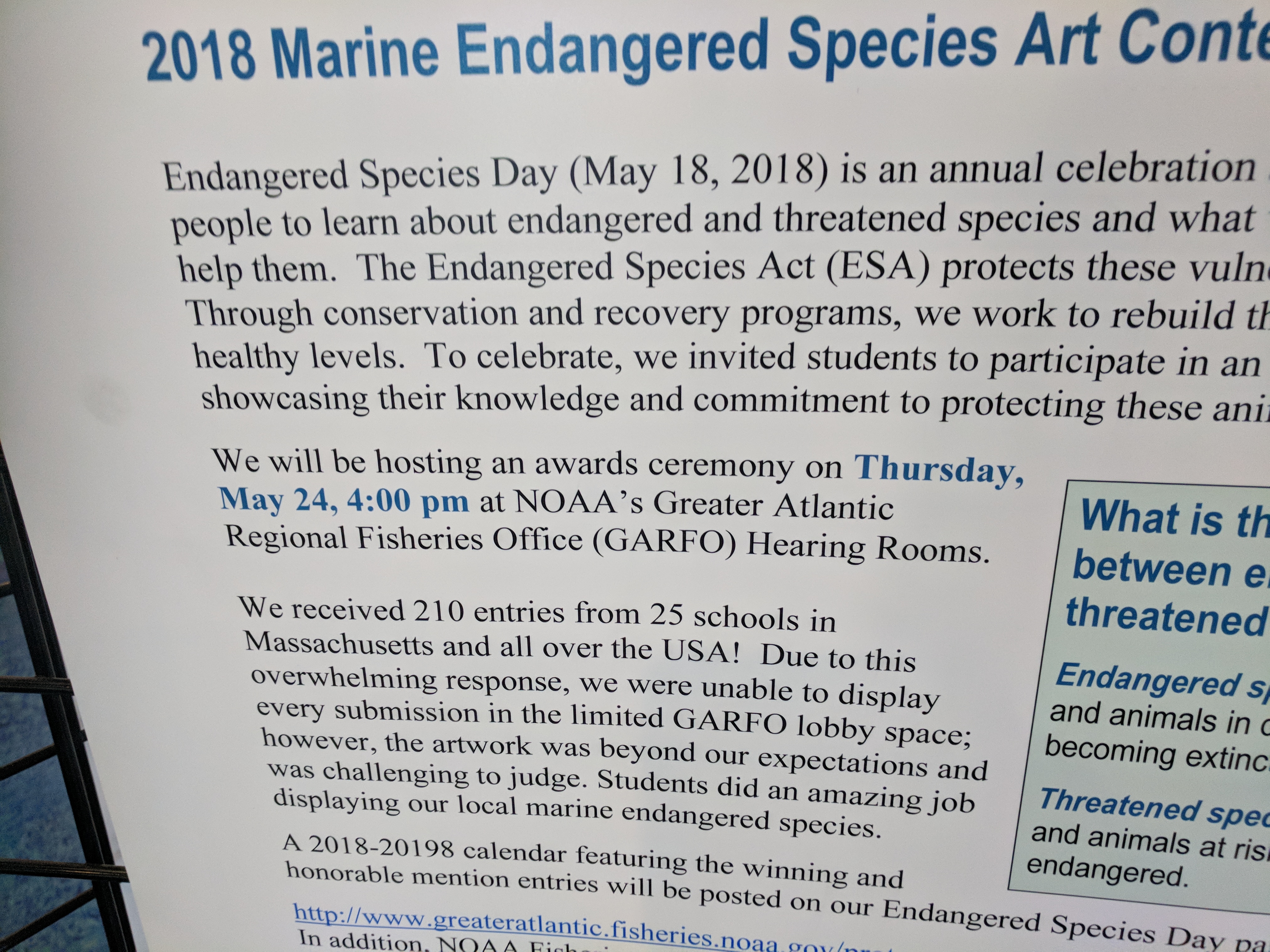 2018 endangered species art contest 2018 NOAA headquarters Gloucester Mass_20180507_© catherine ryan (14) Spread The GMG Love By Sharing With These Buttons:Tweet Click to email a link to a friend (Opens in new window) Email Click to print (Opens in new window) Print Click to share on WhatsApp (Opens in new window) WhatsApp Pocket Click to share on Reddit (Opens in new window) Reddit Like Loading... Published by Catherine posted content / cell phone photos mine, unless otherwise credited (thumbnail portrait of Catherine at MFA, Boston © David Cox photo) https://www.cryanaid.com/ View all posts by Catherine