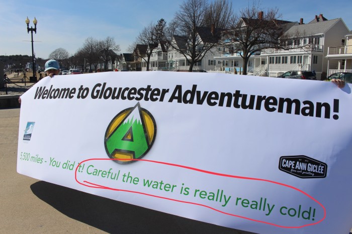 Thank you all for coming out to support the efforts of Adventureman to raise awareness and money for sick children. We are honored he chose Gloucester for this incredible finish. Gloucester showed him what we are made of. Thank you all! Special thanks to Mayor Romeo Theken, the police, Beauport Hotel and Ray Johnston, the Rosa family, Cape Ann Giclee and James and Anna Eves, Kerry McKenna and the Chamber of Commerce, Ringo Tarr, Nichole Schrafft and family, Joey C and family, all our runners especially the children…….the list goes on and on….I LOVE GLOUCESTER!