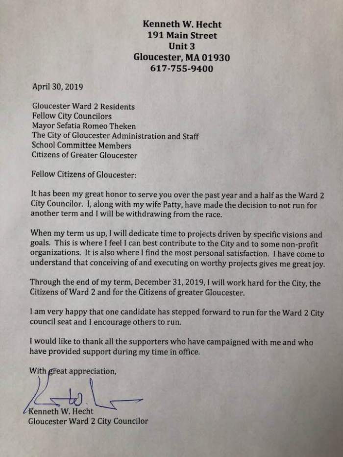 Ken writes, “It has been and will continue to be a great honor to serve through the end of the year as Gloucester’s Ward 2 City Councilor. Today I am announcing my withdrawal from the race for that office. I have learned that setting a vision, identifying goals and executing towards a vision is something that gives me great personal joy especially when combined with what is good for Gloucester.