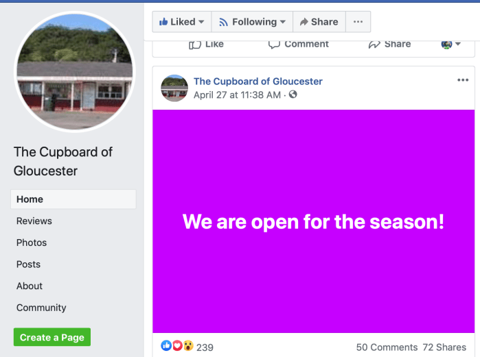 • It’s 2019 and every opening is covered by the restaurant Facebook page and official website. I think, “Hmmm time for a fried fish sandwich at The Cupboard” and sure enough their Facebook page tells me they are open.