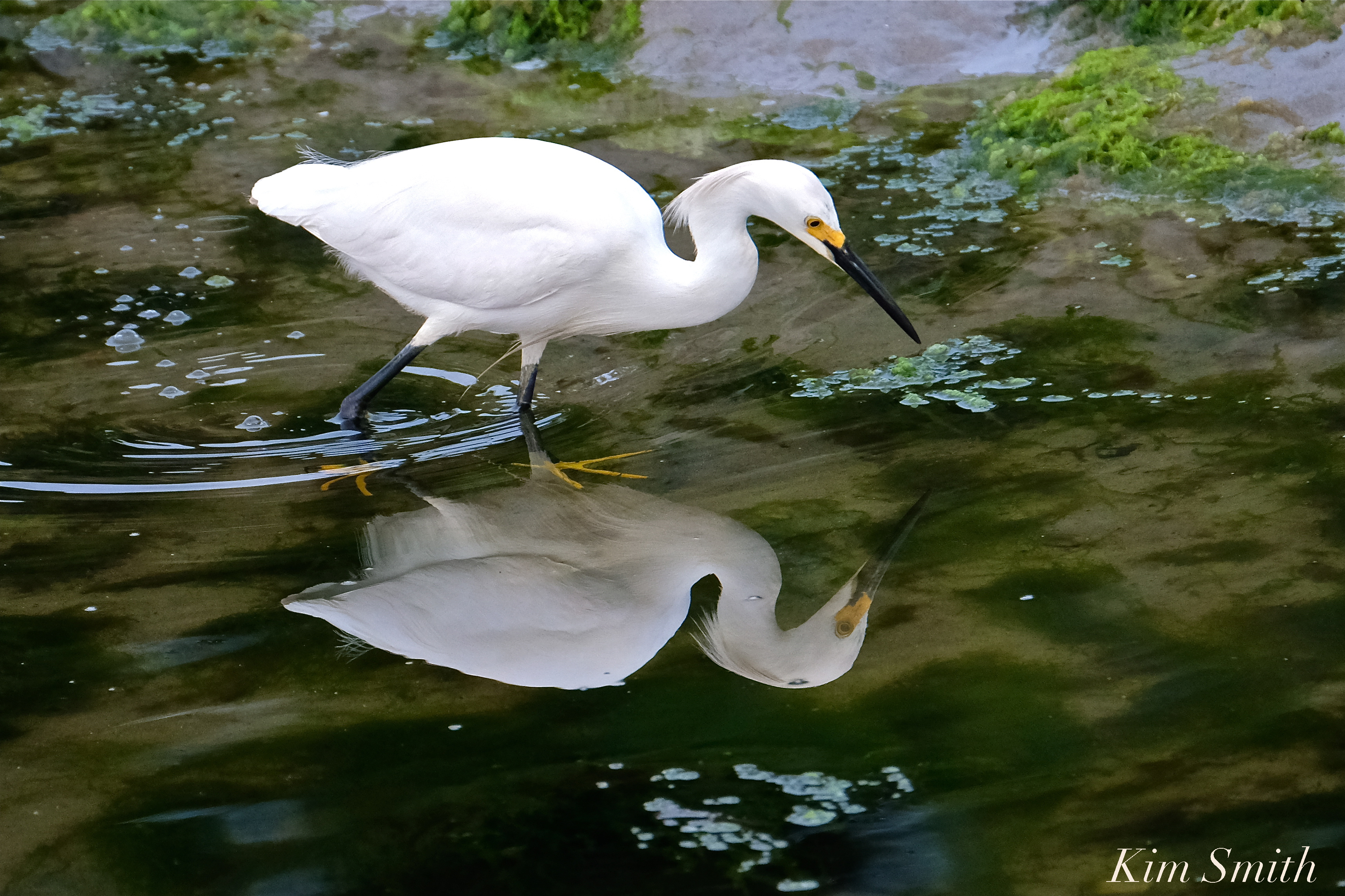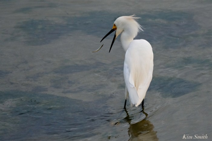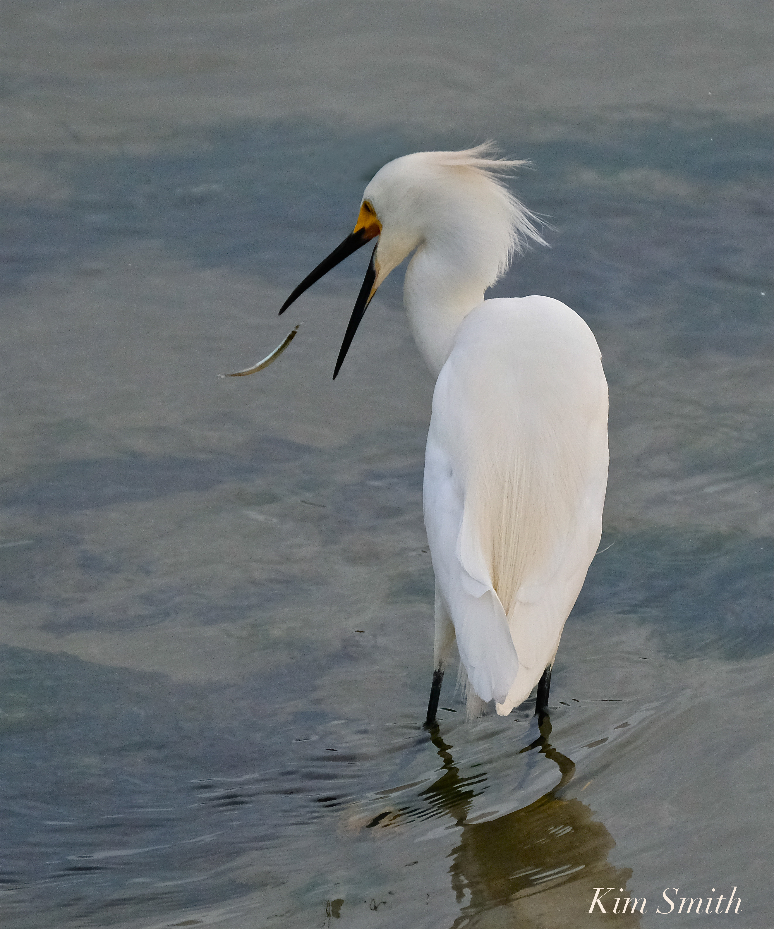Snowy Egrets are the most animated of hunting herons and this one did not disappoint, tossing his minnows in the air, flapping his wings while leaping from rock to rock, stirring the sand with his bright cadmium yellow feet, dip diving, and shimmy shaking his feathers.