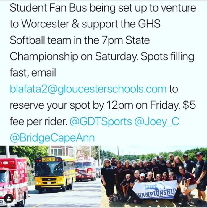 Student Fan Bus being set up to venture to Worcester & support the GHS Softball team in the 7pm State Championship on Saturday. Spots filling fast, email blafata2@gloucesterschools.com to reserve your spot by 12pm on Friday. $5 fee per rider@Joey_C