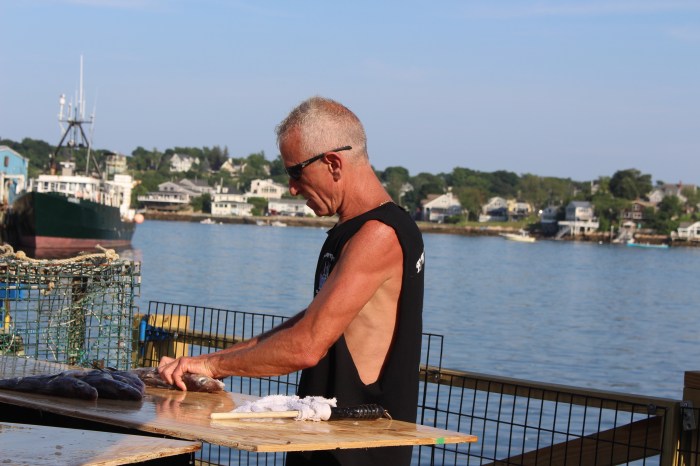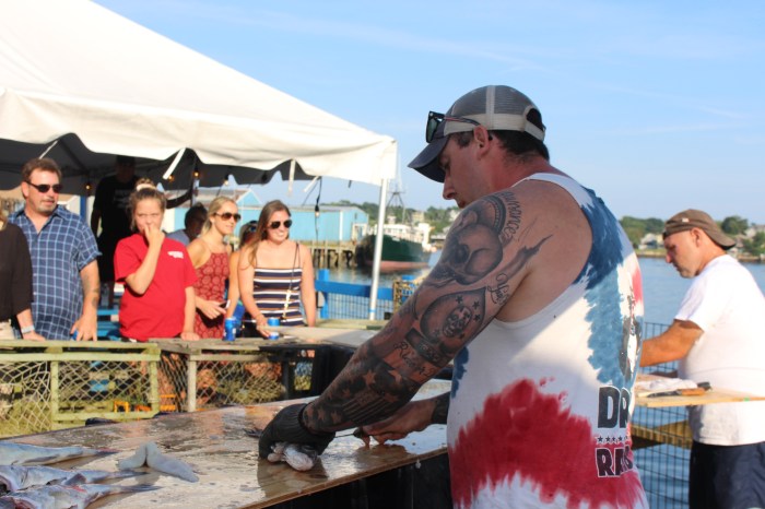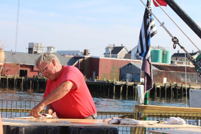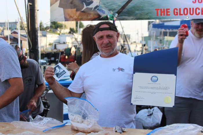 The first Marciano Challenge Fish Filleting event was held at the Gloucester House last night in front of a good sized crowd interested in the finer aspects of fish cutting. Haddock donated by the fishermen was filleted, timed and judged for quality by Mayor Sefatia Romeo Theken and event creator Tina Greel. National Geographic filmed the event for everyone’s enjoyment sometime in the future. The fillets were donated. Dave Marciano was crowned Haddock King (fastest at 5 haddock in 2 min 40 sec) and was generous in sharing the honors with Samuel Sanfilippo (with best fillet) because (as he says) that’s what we do in Gloucester, we share. Thanks Tina, the Gloucester House, the fishermen and fish cutters!