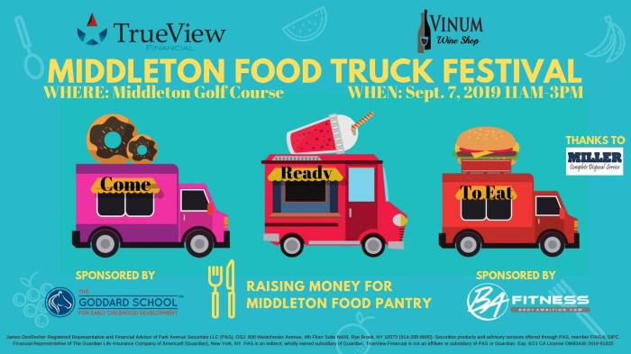 SAVE THE DATE for The Town of Middleton’s 2nd annual Food Truck Festival! Food Trucks, Live Music, Family Fun Zone all on 114 Middleton at the Middleton Golf Course! All are welcome entry is FREE. This Event is to raise money for the Middleton Food Pantry. Brought to you by your local businesses: TrueView Financial & Vinum Wine Shop.