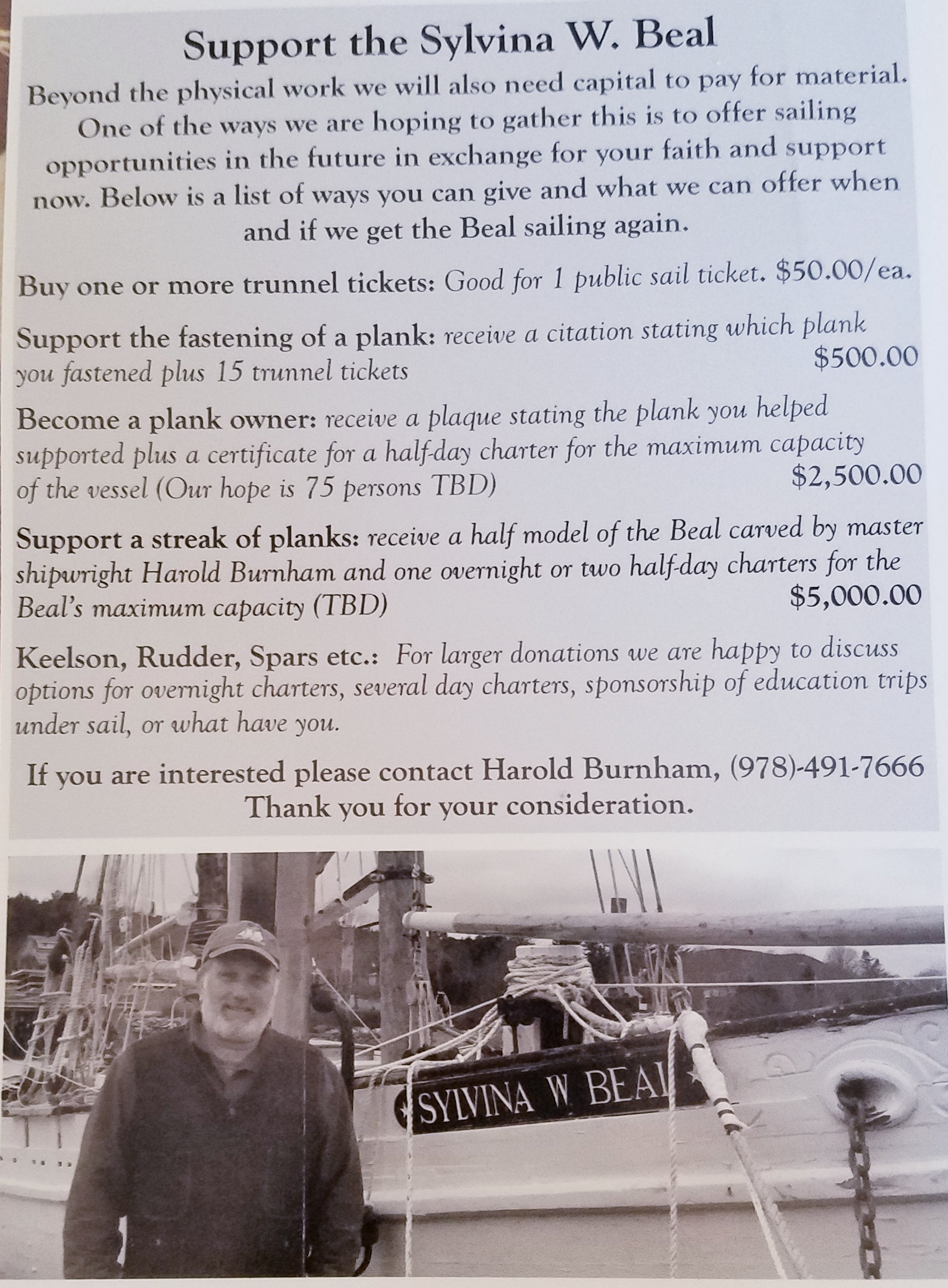 Support the Rehabilitation of the Schooner Sylvina W. Beal. The Burnham Marine Railway at Maritime Gloucester has been hauling boats since 1849. It is the oldest continuously operating marine railway in the country. Currently the Schooner Sylvina W. Beal sits on the railway, built in 1911 in the Adams Yard in East Boothbay, Maine, she is the oldest existing auxiliary knockabout fishing schooner in North America. Over her long life , she has proven to be a worthy vessel, completing over 108 years of active commercial service as a fishing vessel, a sardine carrier and a windjammer. Harold A. Burnham and Mary Kay Taylor as stewarts of the historic vessel aim is to have her listed on the National Historic Register and rehabilitate her for future use as a commercial charter, education and research vessel operating out of Gloucester, Massachusetts. There hope is that she will help to keep our maritime heritage and culture alive and present on Cape Ann!
