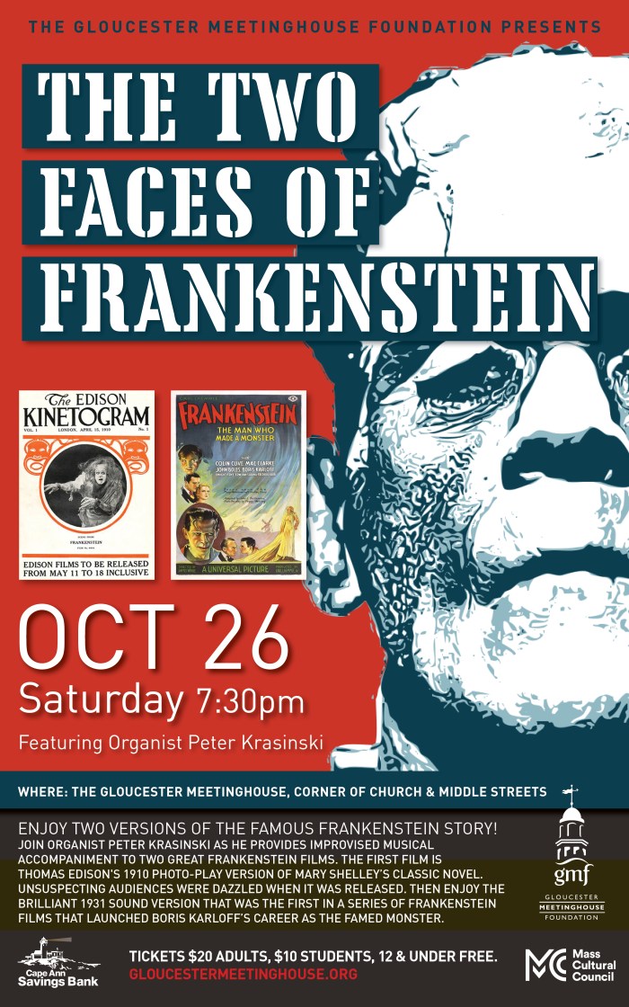 Celebrating the season of dark and windy nights, hobgoblins, and scary creatures, the Gloucester Meetinghouse Foundation presents two landmark silent movies featuring the Frankenstein monster and accompanied by world-renowned sonic artist and organist Peter Krasinski.