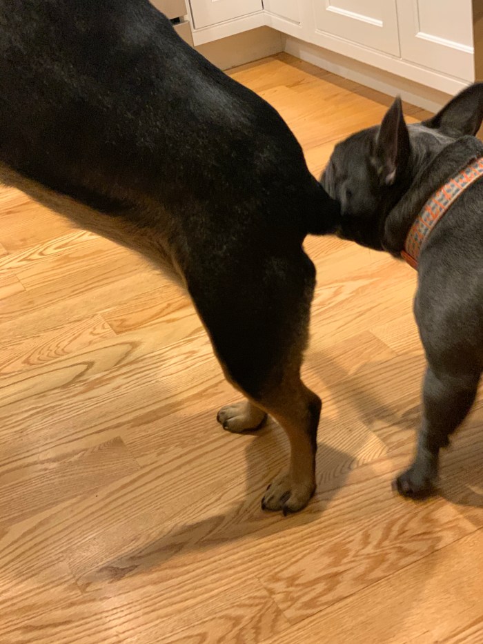 He’s always sniffing Bella’s butthole. Then Bells takes a poop in the yard and he goes over and puts his nose in that too.