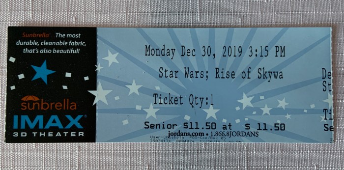 Recently, of course, the “final” episode was released and off we went to see it at the IMAX with Joey one rainy afternoon. The IMAX experience, surround sound, seat bumping theatrics certainly added to the experience but I found myself cheering and teary eyed and remembering what it felt like to be 21 years old again. It was another story of good triumphing over evil, heroic deeds and hope. I LOVED it and will plan to see it again with my son. I immediately recognized that the Star Wars franchise has ushered me through adulthood. We are now retired and getting senior discounts and the franchise’s last episode is on the big screen.