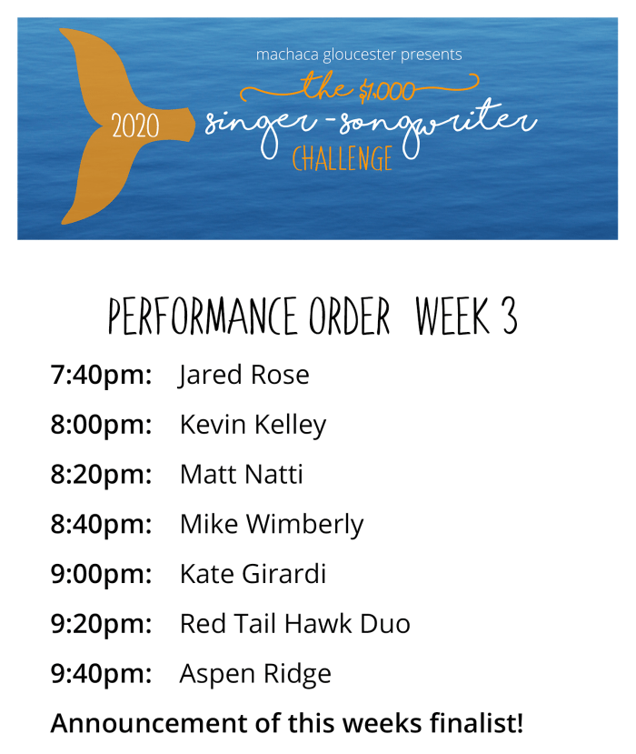 The $1,000 Singer-Songwriter Challenge returns to Machaca Gloucester for an 8-week run this winter starting on January 15, 2020. For 7 weeks, up to 8 performers play up to 3 songs or 15 minutes before a panel of live judges. At the end of the first 7 weeks, one performer is chosen to move on to the week 8 finals and a chance to perform in the finals for a piece of the $1,000 prize. Interested in performing? Reach out through our Facebook page or email Chris at clangathianos@me.com with your name, desired week, and a sample of your music. There is never a fee to participate, and due to high demand, performance slots are limited!