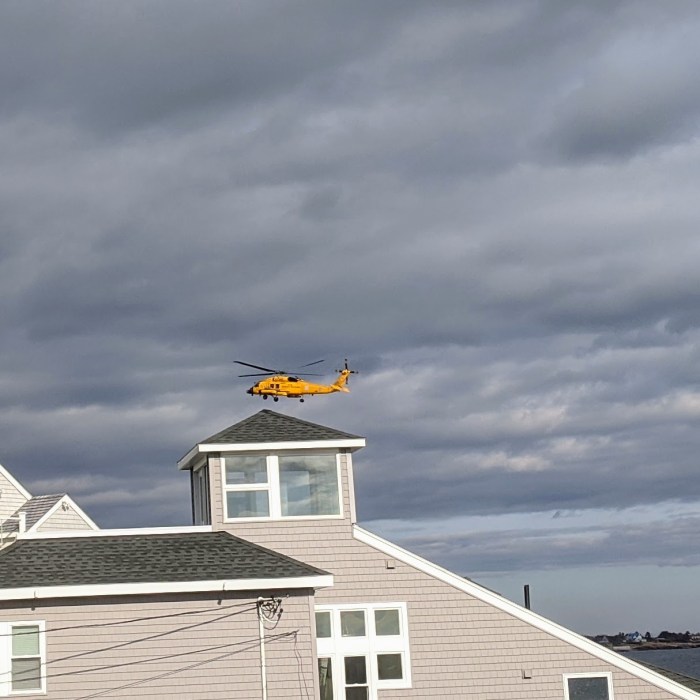 Since 1:30pm – Helicopters are sweeping back and forth close to shore, low and high, from Eastern Point past Long Beach and Thacher Island. Police from neighboring communities are helping; we have seen a few vehicles park and walk the rocky coastline and several vessels.