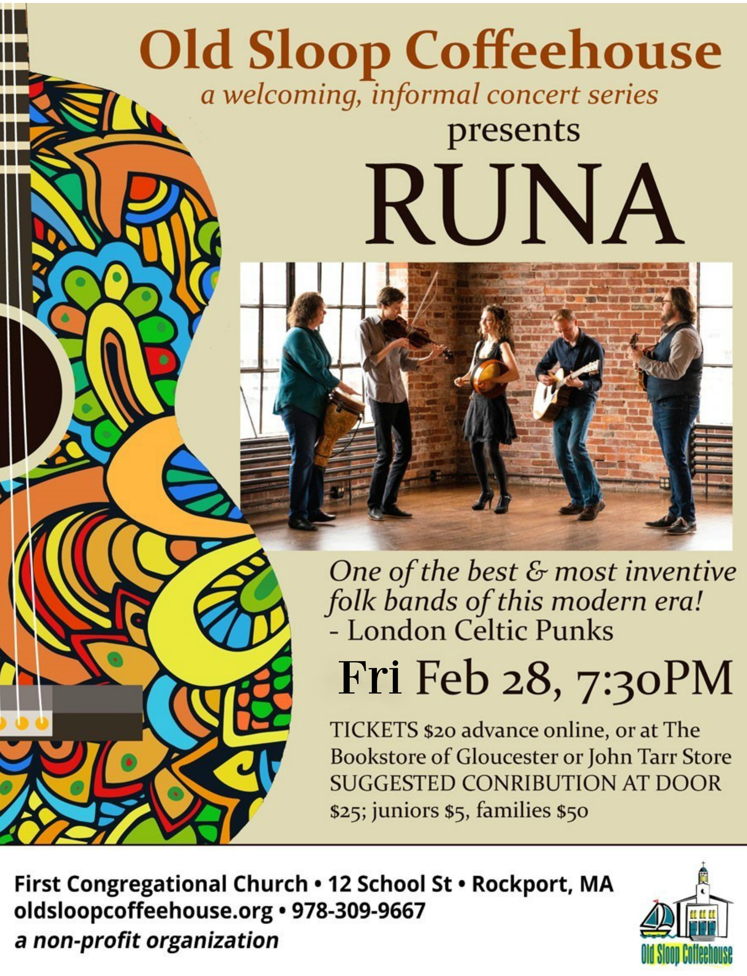 SELLOUT WARNING! There are only a few tickets left for this concert. Please note that this concert is FRIDAY night. Some of our fliers mistakenly said Saturday. Runa comes to Old Sloop Coffeehouse this Friday, February 28 at 7:30PM. Celebrating its tenth anniversary as a band, Celtic-American roots music “super group” RUNA pushes the boundaries of Irish folk music into the Americana and roots music formats. Interweaving the haunting melodies and exuberant tunes of Ireland and Scotland with the lush harmonies and intoxicating rhythms of jazz, bluegrass, flamenco and blues, they offer a thrilling and redefining take on traditional music. Visit https://oldsloopcoffeehouse.org for tickets and more information.