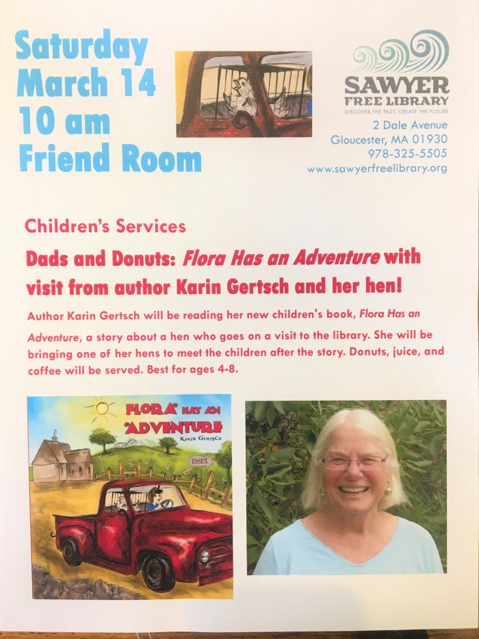 Author Karin Gertsch will be reading her new children’s book, Flora Has an Adventure– a story about a hen who goes on a visit to a library–at Sawyer Free children’s library on March 14th. She’s bringing a hen for kids to meet! Dads and Donuts storytimes are for everyone.
