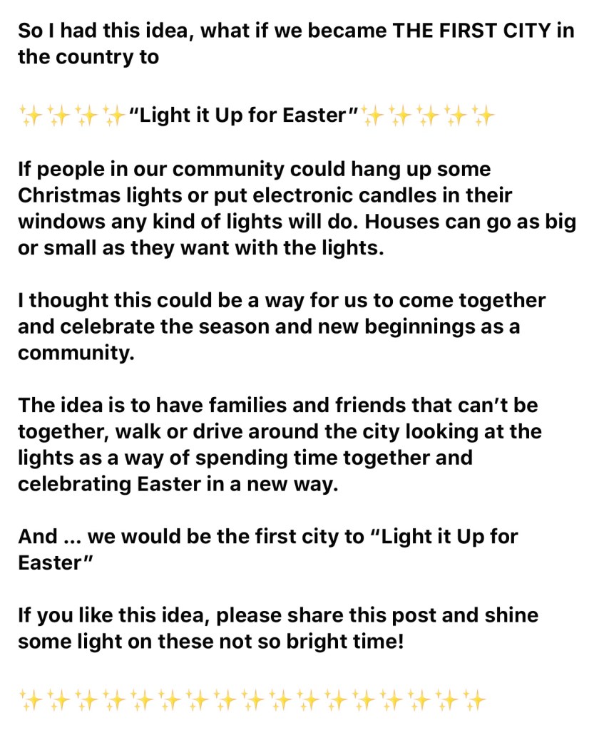 We are trying to get the word out to our community. I have helped organize the Teddy Bear Hunt , but I really want to shine our light during these not so bright times and see if we can get the Island to Light it up for Easter!