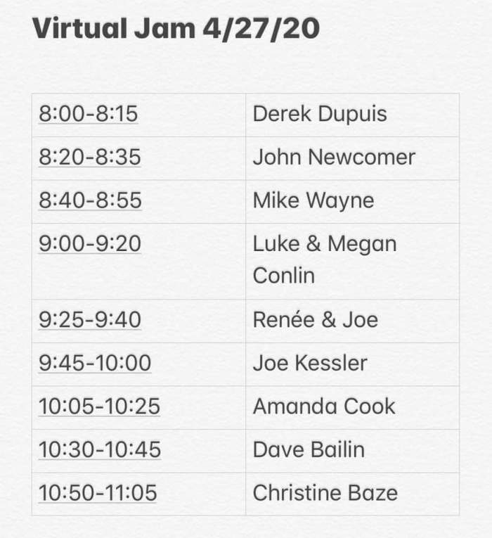 Here is our schedule for tonight’s Jam! Tune in a few minutes before 8pm for our greeting and intro!!