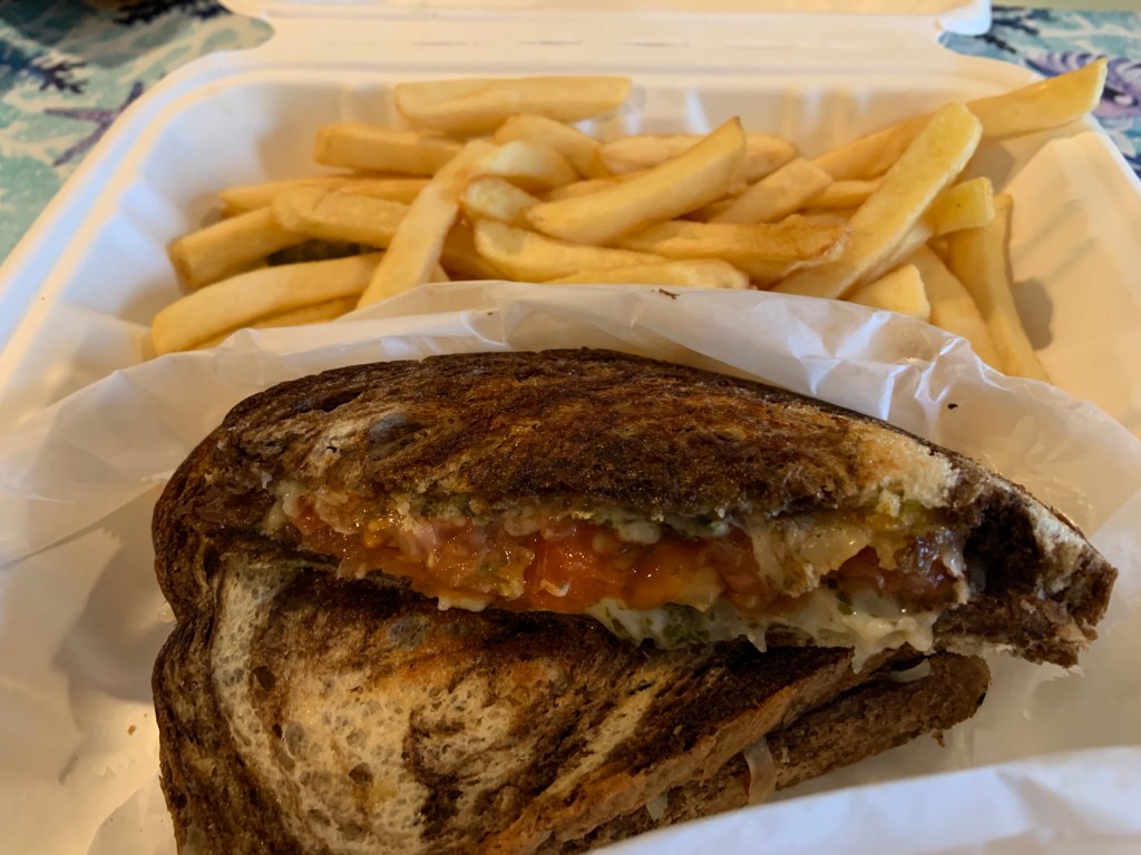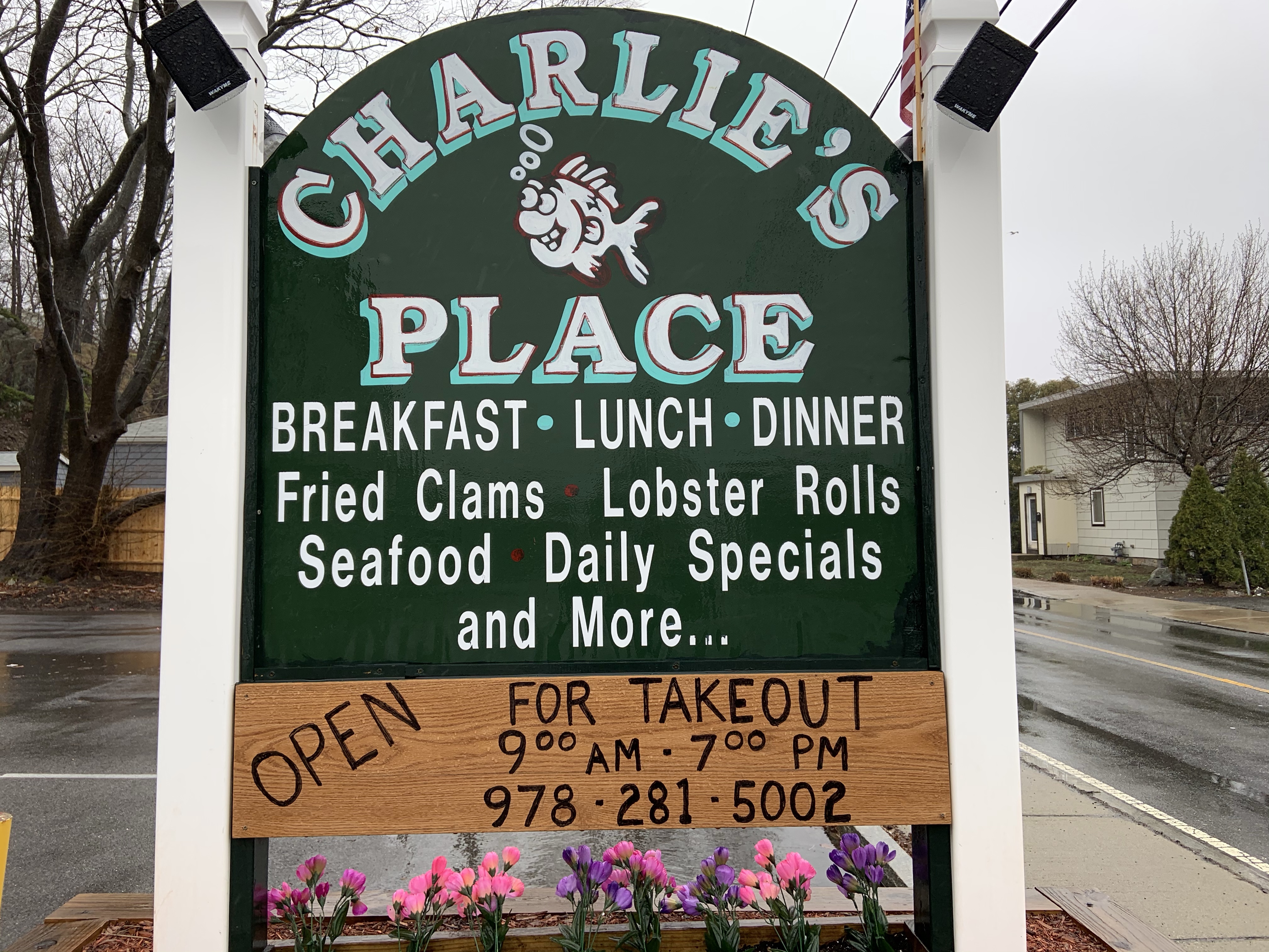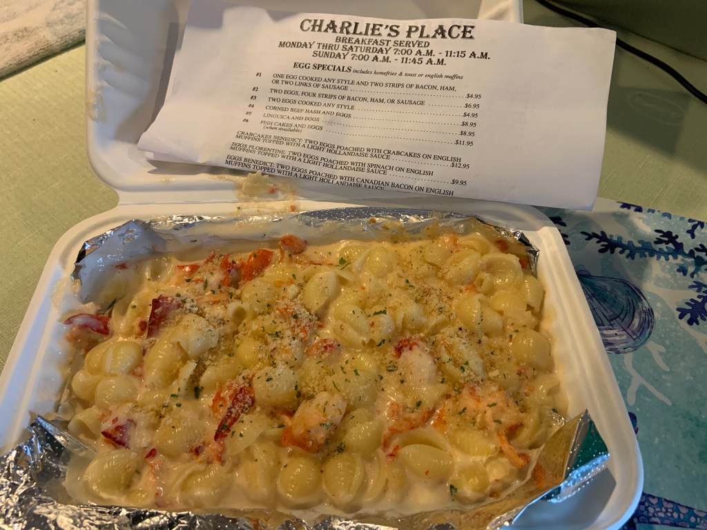 When we stopped at Charlie’s Place for our takeout, another customer commented that she didn’t know Charlie’s was open but was very happy to find out that it was. For that lady and everyone else who might not realize, Charlie’s is open for takeout and it’s worth the call! Lobster Mac and cheese for me, hot caprese sandwich for Jim! Call 978-281-5002