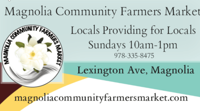 Magnolia Community Farmers Market are held on Sundays from 10:00 am – 1:00 pm throughout the Summer! Produce, Dairy Products, Meats, Seafood, Crafts, and MORE!