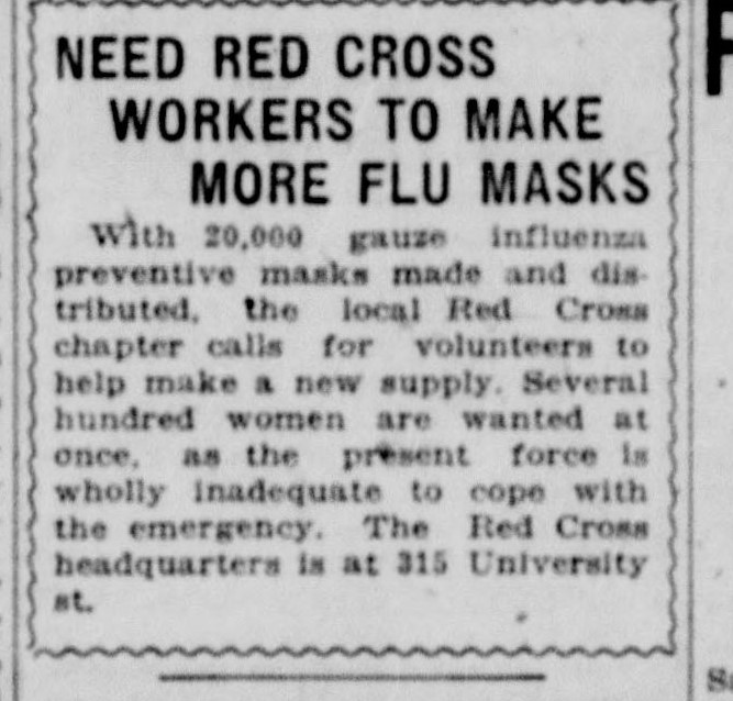 “The work of the nursing service has been one of the demonstrations which, in a way, can be measured. When it is realized that in response to the advertised and personal requests for volunteer service over 200 responses were received, and that the hours of service were long and the work strenuous, I think everyone must agree that no words can express proper appreciation of the ladies who have given their time and strength to nurse their sick townspeople. To ask a woman to leave her home at 3 o’clock in the morning and have her cheerfully comply shows the material of which the women of your city are made…Classed with nursing service has been a specialized group which has been properly called the Mask Factory. As influenza is a respiratory disease, transmitted almost entirely by close contact with secretions of the nose and mouth from coughing, sneezing and spitting, the protection of the workers depended upon an ample supply of masks. The mask factory worked 24 hours a day until there was an ample supply, and then with the usual enthusiasm of all workers, demanded an additional duty to perform. All such demands were readily granted and in this particular instance warm wraps and bed slippers (for the patients) were made the additional duty.”