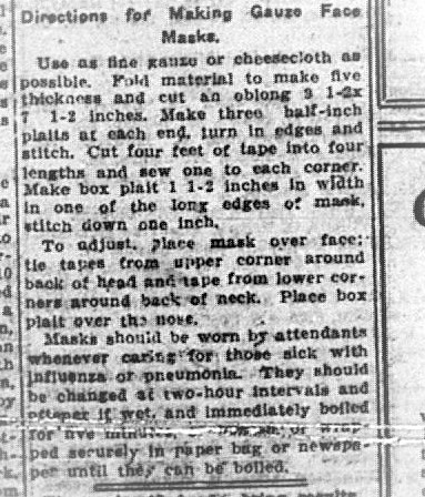Use as fine gauze or cheesecloth as possible. Fold material to make five thickness and cut an oblong 3-1/2 x 7-1/2 inches. Make three half-inch plaits at each end, turn in edges and stitch. Cut four feet of tape into four lengths and sew one to each corner. Make box plait 1-1/2 inches in width in one of the long edges of the mask, stitch down one inch. To adjust, place mask over face: tie tapes from upper corner around back of head and tape from lower corners around back of neck. Place box plait over nose. Masks should be worn by attendants whenever caring for those sick with influenza or pneumonia.Gloucester Daily Times 9/30/1918 Flu masks / Face masks