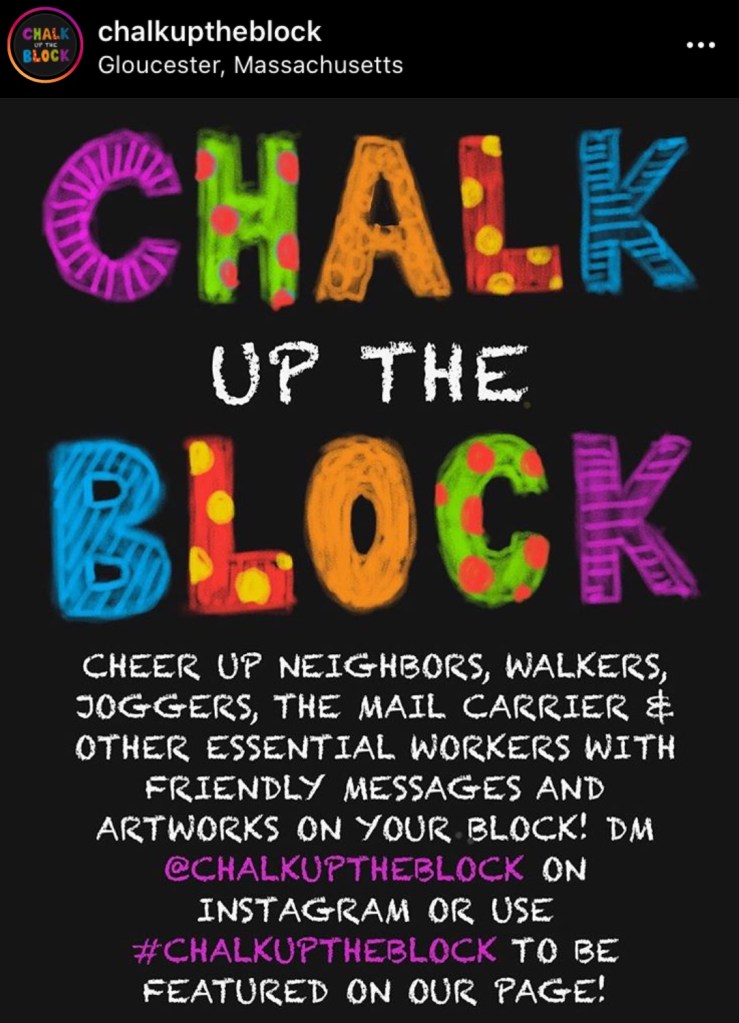 Hi,My name is Arjen Steegstra. I am a Gloucester resident looking for promotional support in developing a social media trend that I think is important for increasing morale in this troubling time. Public art is a reflection of its place and time. Public art activates the imagination and encourages people to pay attention and perceive more deeply the environment they occupy. It stimulates learning and thought about our society, about our interconnected lives, and about the social sphere as a whole. Chalk is a very accessible, legal, and non-permanent medium that everyone can use to show their support. It’s also fun! Originally my mission was to cheer up neighbors, walkers, joggers, the mail carrier and other essential workers with friendly messages and artworks on your block during quarantine. However, due to the recent tragedies, it has taken a turn to support the Black Lives Matter movement and help take a stance against police brutality. Using the instagram page @chalkuptheblock and the hashtag #chalkuptheblock I am able to share all of these messages on a single platform and bring attention to the supportive efforts in our community. I attached a link to the instagram page.