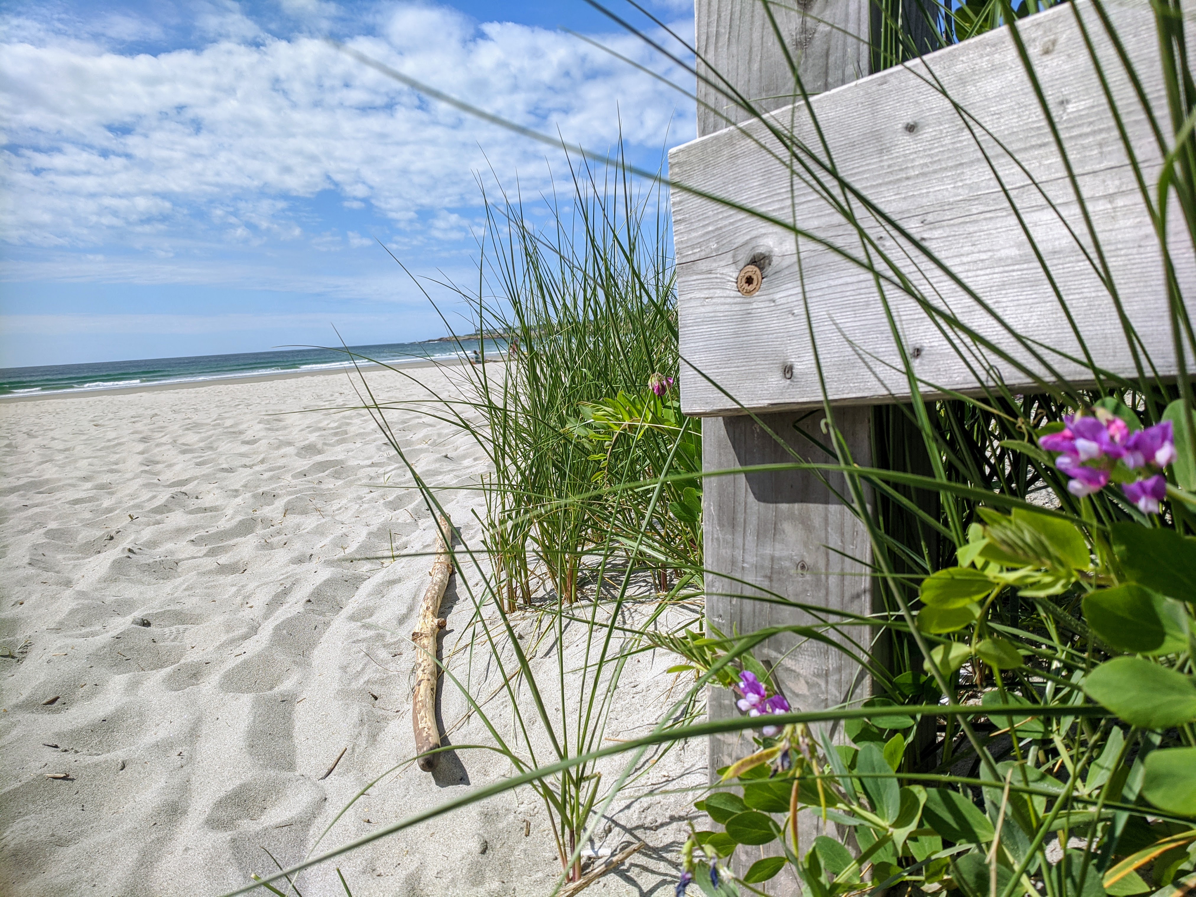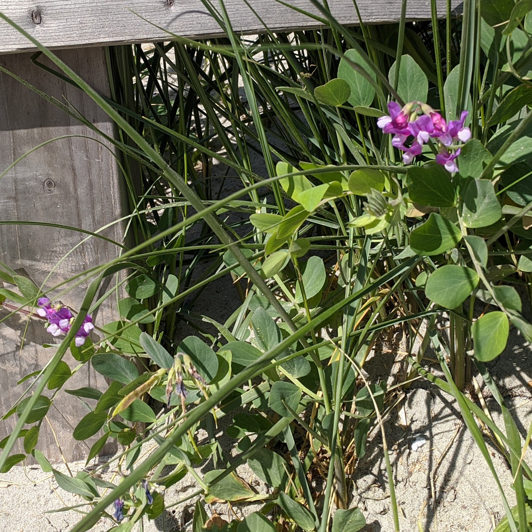 Beach pea (also known as sand pea) is a sweet native wildflower (Lathyrus japonicus) that’s easy to spot in the dunes– from any of the walkways.