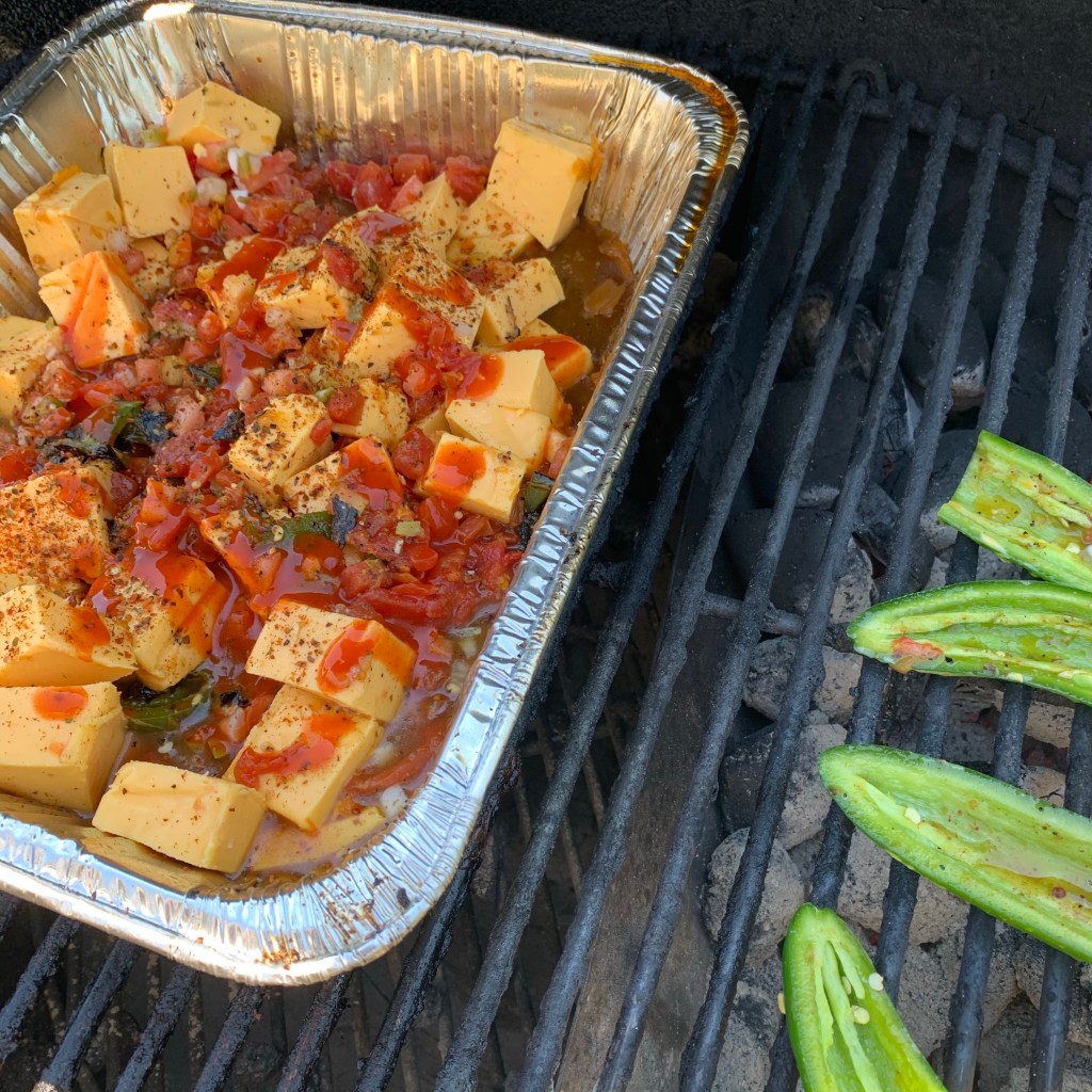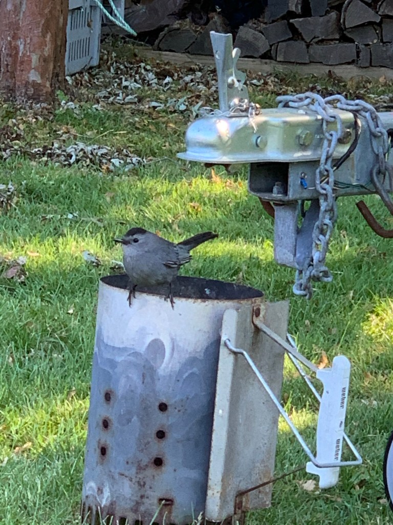 We’re eating chicken by the firepit and this catbird is all up in our space chowing down on bits of chicken we’re tossing it.