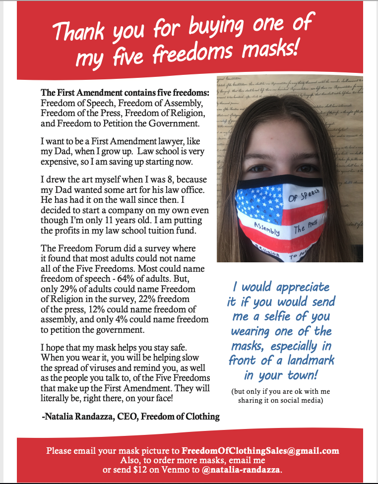 My daughter, Natalia, started a mask business. She first started with her “five freedoms” mask – one that she based on a drawing she made for my office a while back. That sold like crazy and so she decided to do a Sicilian flag one.