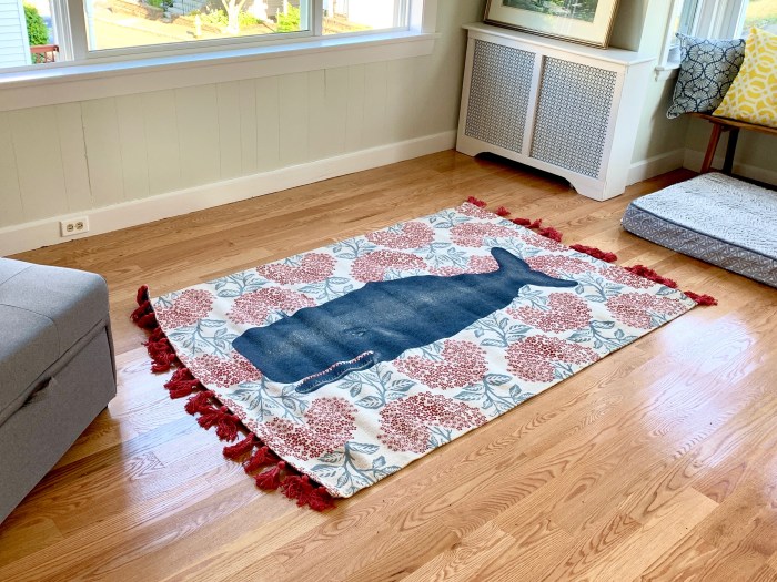 Moving is no fun….especially not in July when you’d like to be on the boat or at the beach and especially not when, after months from working from home, I am now back in my office trying to keep “normal” hours.Β That having been said, there are upsides.Β Our new home is coming together nicely and my super cute whale rug arrived yesterday just in time to put a smile on my face.Β We talk often on Gloucestercasts about how I’m a bargain shopper.Β This gorgeous rug was just under $50 and will looks perfect in our new living room.Β Β I ordered it online at RugsUSA.
