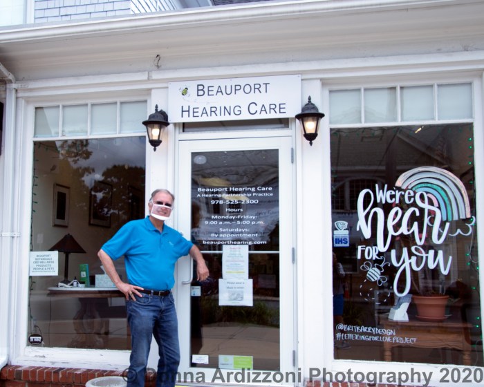 David from Beauport modeling their masks for the hearing impaired. They are selling them there as well for $10.00. These masks can help the hearing impaired read lips while using a mask.