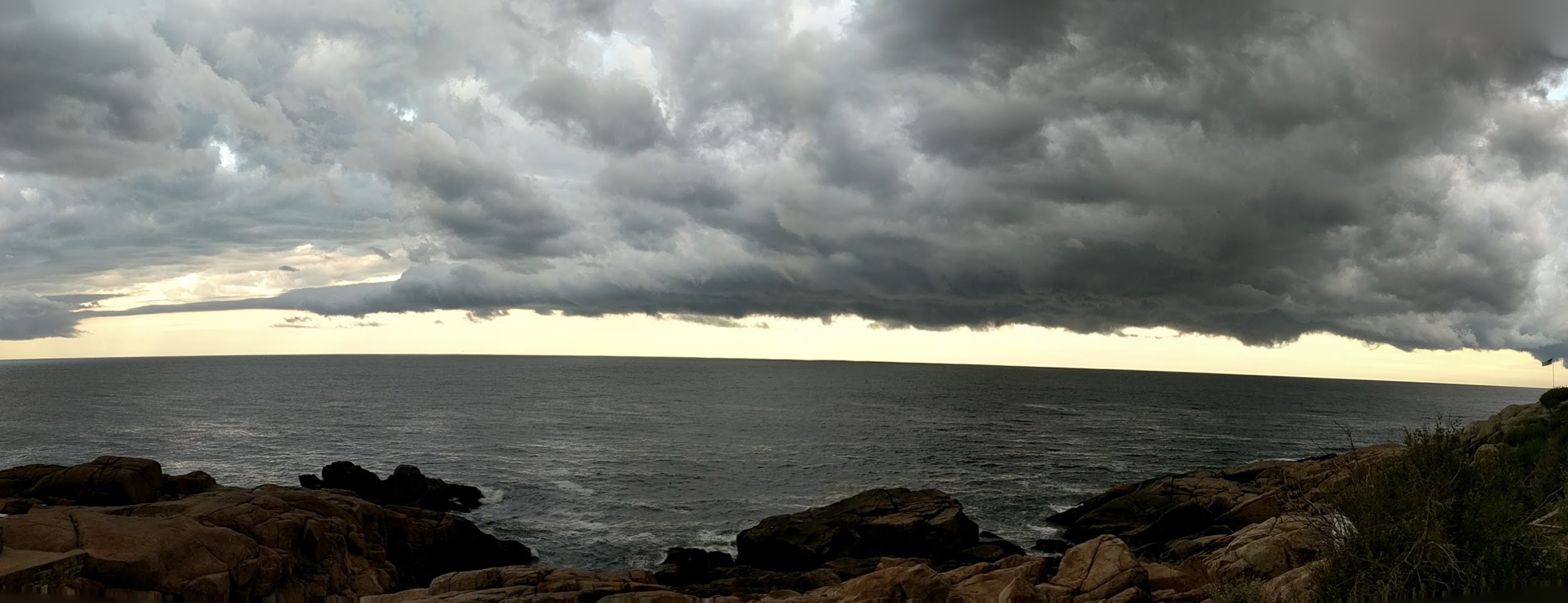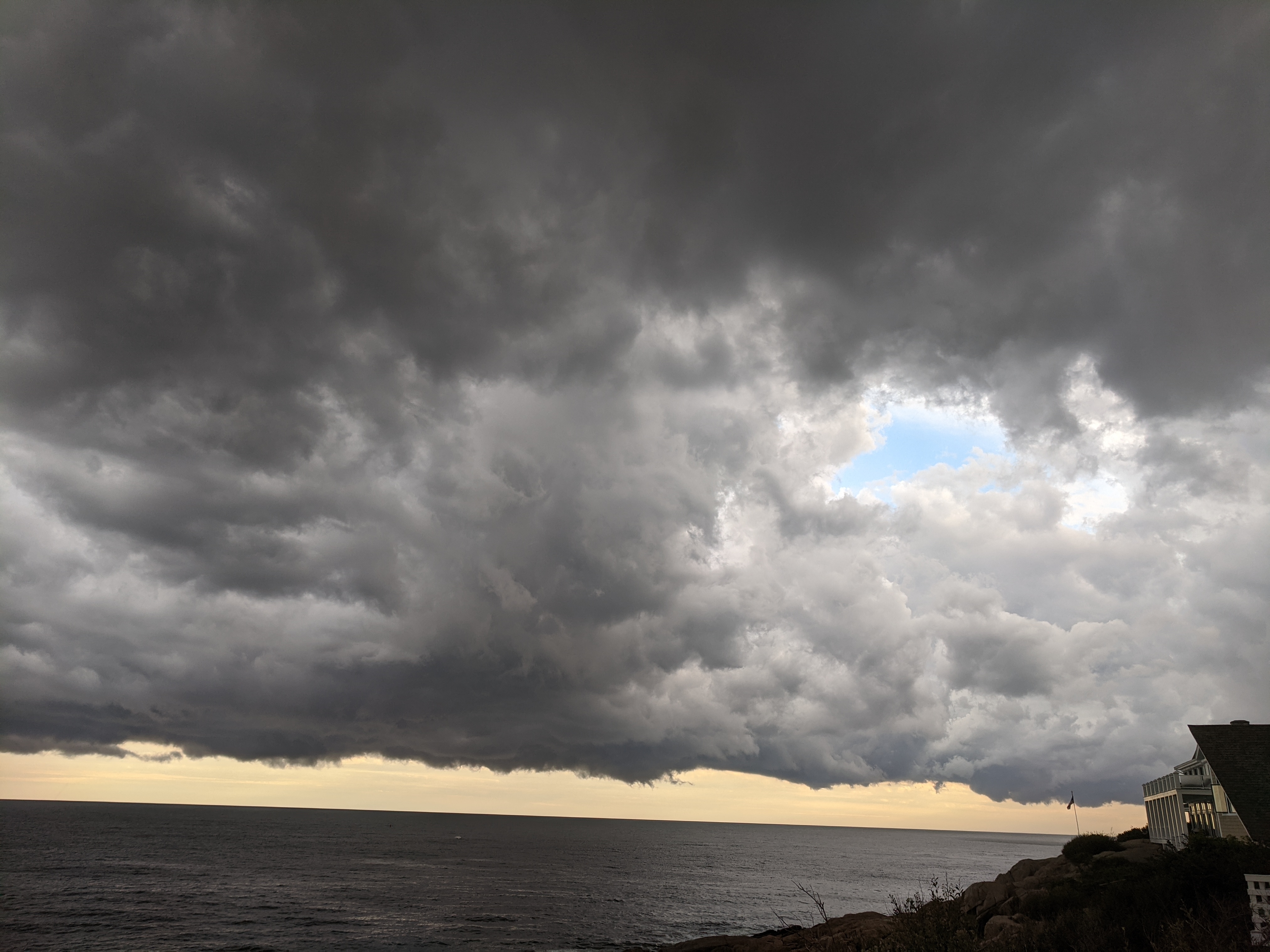 big August sky flash rain – blackened sea and clouds plus blue and peach sky patches