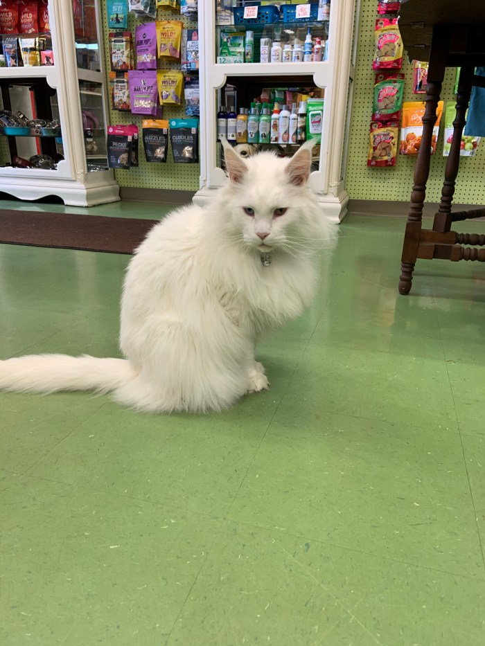 Meet Walter. You can be forgiven for thinking he is a small dog…..he’s a very large cat. He’s the store pet at Animal Krackersat 232 Main Street. Even though we have no pets, sometimes we find we need pet supplies and this is usually the first place I like to check. Today, however, was the first time I met Walter. He greeted me in a friendly, up-close manner (as cats like to do) to give approval to the cat food I was purchasing. Service is knowledgeable and efficient. Go meet Walter! He appears to be posing for his mug shots here.