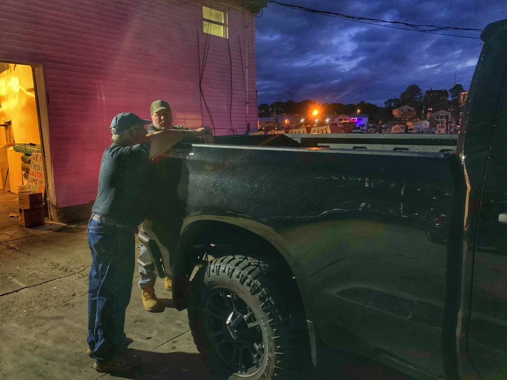 Captain Pete and Trapper jawing away before they hop on their boats to go lobstering.