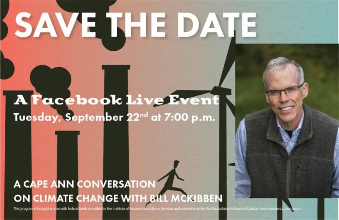 On Tuesday, September 22, 2020 from 7-8pm David Abel, Pulitzer-prize winning Boston Globe reporter, will interview Bill McKibben, environmental advocate, author and founder of 350.org, about lessons learned and future solutions concerning the climate crisis in our local community and beyond.