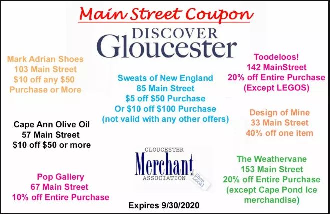 Stroll down Gloucester’s Main Street to discover unique boutiques and restaurants! Enjoy special shopping offers with this coupon card from participating boutiques along the route now through September 30, 2020. After enjoying a delicious lunch or dinner under the stars, be sure to take your coupon from partnering restaurants for a shopping adventure. Please wear a mask and follow social distance guidelines.