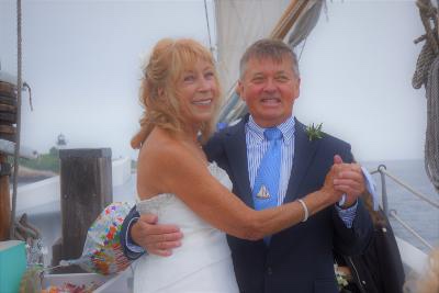 Brian and I did a “following COVID protocol” wedding on the Schooner Ardelle a few weeks ago. It was a small family wedding. Our dear friend and talented musician, Chelsea Berry, not only sang for us, but she was our officiant. The sky didn’t let loose its rainfall until after our vows; we had a lovely dinner at Castle Manor after we all went home and dried off! Attached are a couple of photos.