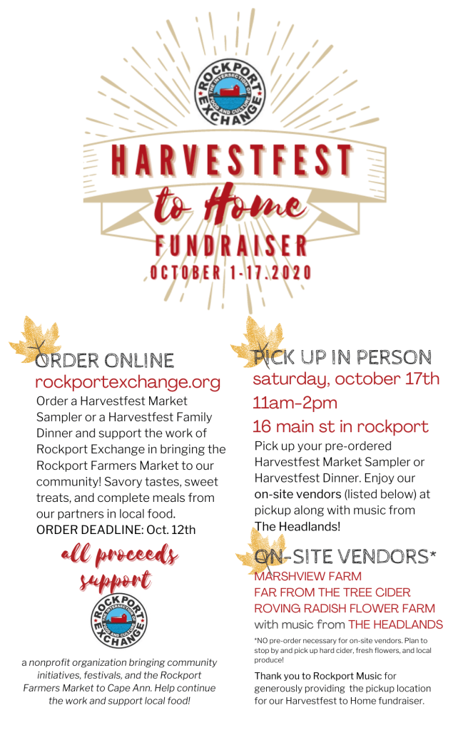 We’re trying to keep Rockport Exchange alive so we can continue to have the Rockport Farmers Market and bring back Harvestfest in 2021 and all the rest of the stuff our community nonprofit has done over the years. We are running a Harvestfest to Home Fundraiser with the idea that if you can’t come down to the wharf in Rockport for Harvestfest, you can pick up some local food and celebrate Harvestfest at home with friends and family!