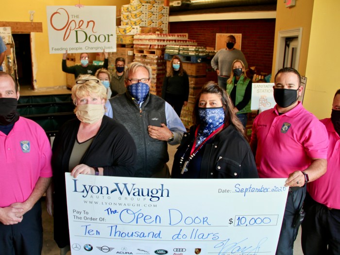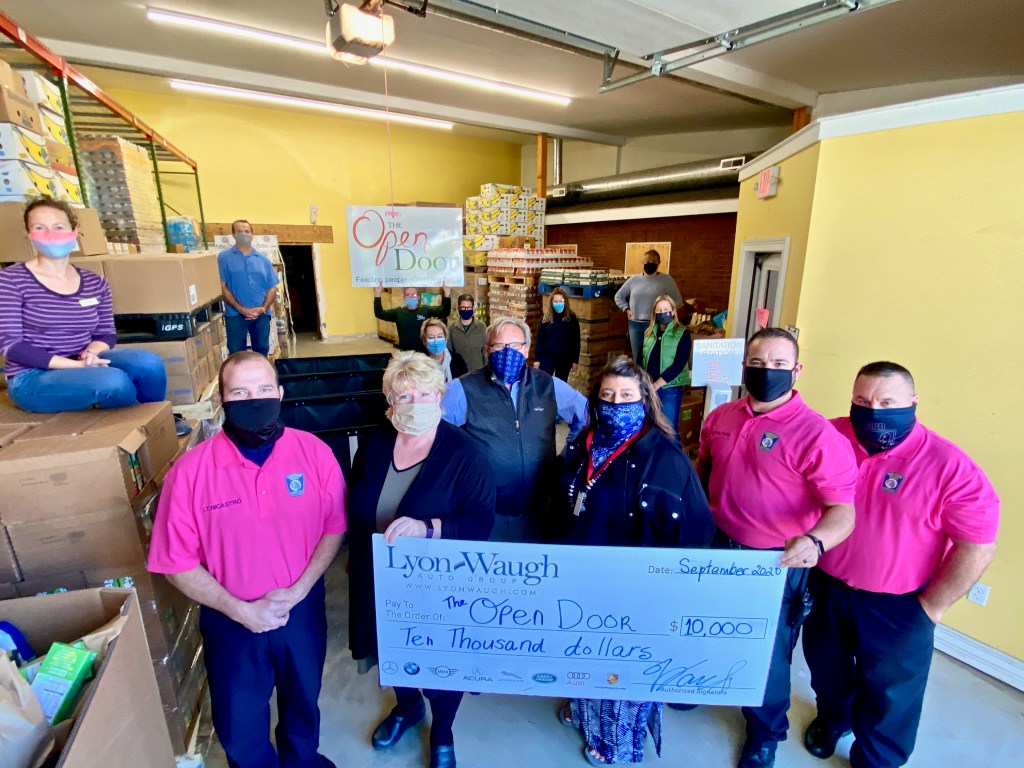 While donations are always incredibly important to The Open Door these unprecedented times certainly create even more need. Thanks to community generosity, like that of the Lyon Waugh Auto Group, they have been able to make a significant impact in more than 5,000 households. The number of meals distributed is well over 800,000 and almost 30,000 meals have been prepared in Open Door’s very own kitchen. The food pantry has recently reopened for shopping as well on Tuesdays by appointment. With the holiday season soon approaching and many annual fundraising opportunities missed due to Covid restrictions, help and support are critical. Not only did Warren Waugh present a $10,000 check yesterday, but he pledged another $10,000 to come when the holidays are upon us. Lyon Waugh is well known, rightfully so, for generosity in the Cape Ann community and beyond….but, also for treating their many employees incredibly well. One of the many ways that is demonstrated is through a much anticipated holiday party. With large gatherings not taking place this year, and that holiday event canceled, Waugh was pleased to announce that they would use those resources to make the second donation.