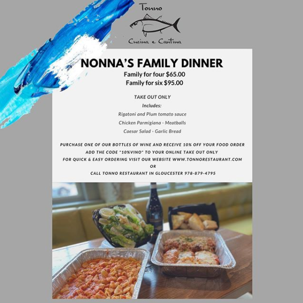 This take out order will bring a tasty meal from our family here at Tonno, to your family right at home. Order online or over the phone today!